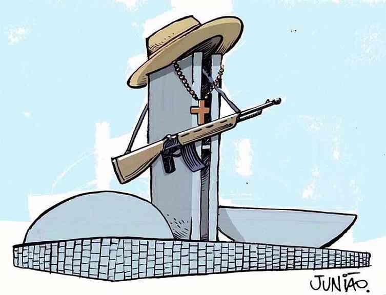 Na charge de Junião, a representação da bancada do boi, da bala e da Bíblia no Congresso