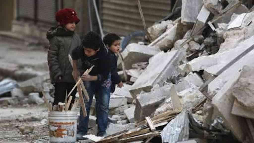 Crianças recolhem destroços após ataque aéreo em Aleppo