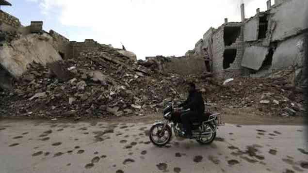 Homem conduz sua motocicleta em frente a escombros de prédios em Maaret al-Naaman, na província de Idlib, Síria