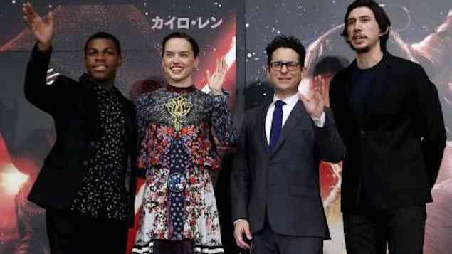 Diretor de Star Wars, Abrams (2º à direita), e atores Boyega, Ridley e Driver durante evento no Japão