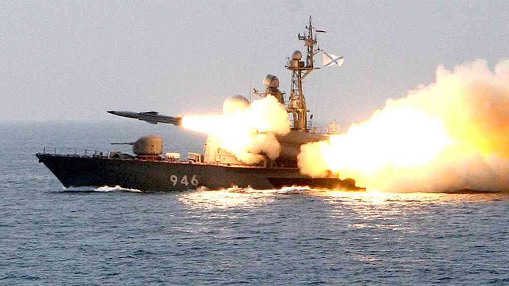 O míssil supersônico Moskit é lançado em exercícios realizados no Mar do Japão. Destróieres japoneses rumam para o local