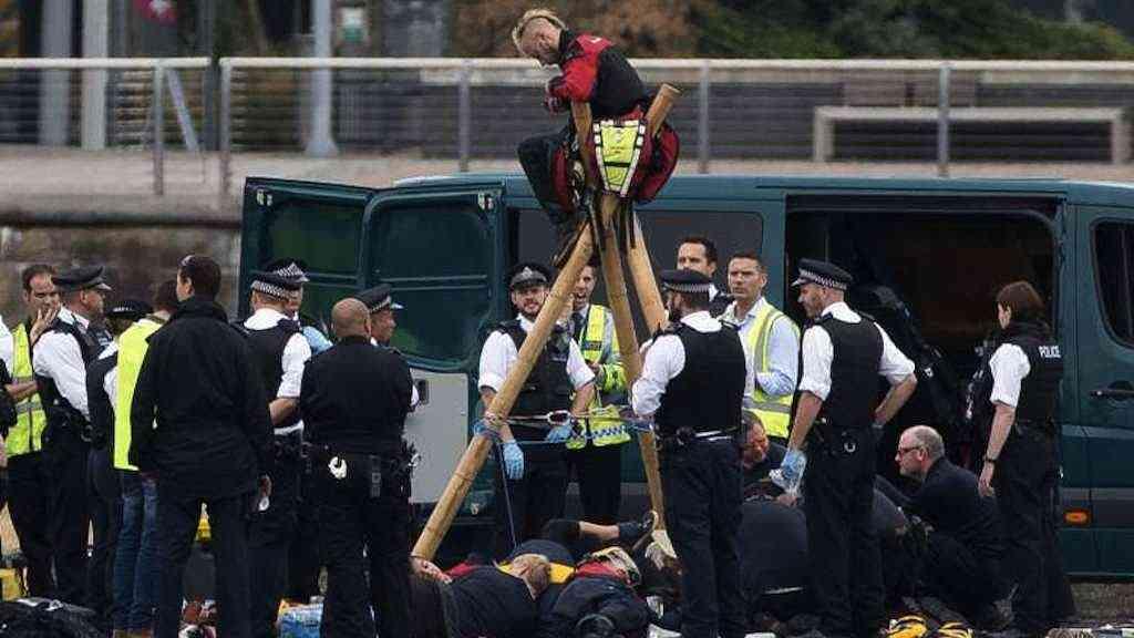 Mais de 120 voos foram cancelados, adiados ou desviados do aeroporto, que fica alguns quilômetros ao leste do bairro financeiro de Canary Wharf, depois que nove manifestantes se amarraram na pista de pouso e decolarem. Mais tarde, ainda na manhã desta terça-feira pelo horário local, a polícia informou que prendeu os nove e que a empresa aérea estava se preparando para retomar os voos.