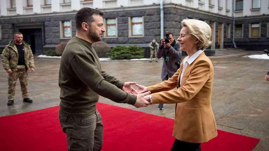 A chefe da Comissão Europeia e o presidente do Conselho Europeu viajaram a Kiev para demonstrar apoio à Ucrânia perto do primeiro aniversário da invasão pela Rússia em 24 de fevereiro de 2022.