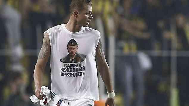 O meio-campo do Lokomotiv de Moscou Dmitry Tarasov mostrou na terça-feira, após a partida no quadro da Liga da Europa com o clube Fenerbahce, uma camisa com o retrato de Putin e a inscrição “o presidente mais cortês” sob o seu uniforme esportivo, o que pode provocar ações disciplinares por parte da UEFA.