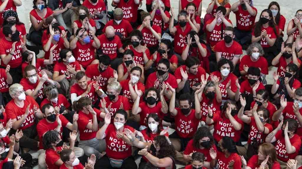 Nesta quarta-feira, manifestantes pró-Palestina vestindo camisetas vermelhas, que diziam “Não em nosso nome”, invadiram o prédio do Congresso, com cartazes com a frase “Pare de armar Israel”.
